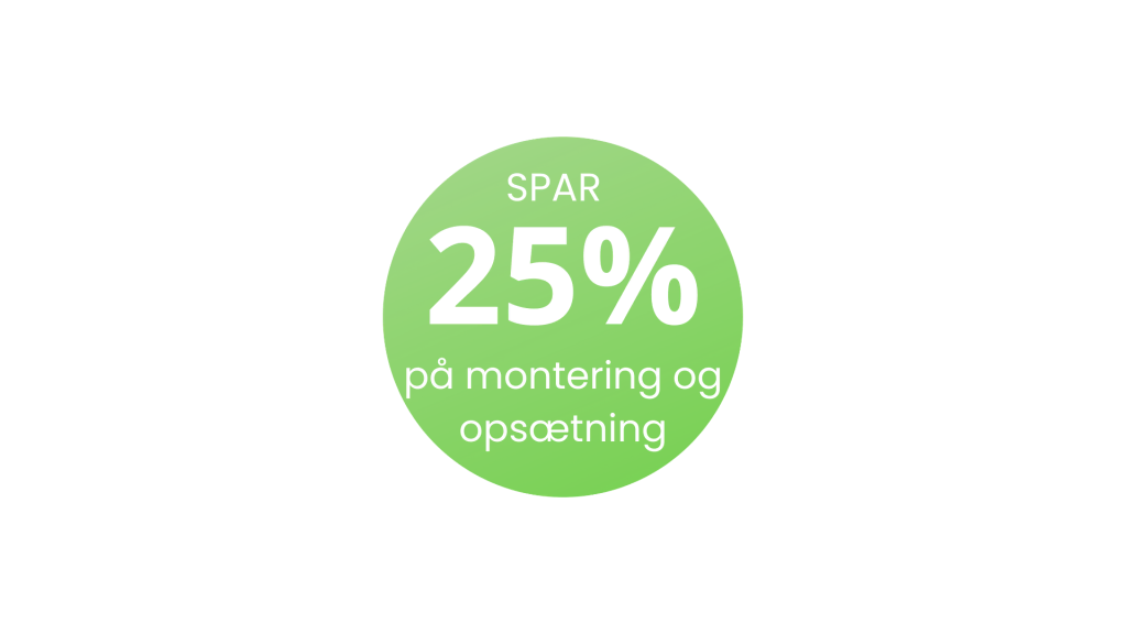 I hele februar og marts giver vi 25% rabat på professionel montering og opsætning. Send din forespørgsel via kontaktformularen – så klarer vi resten.